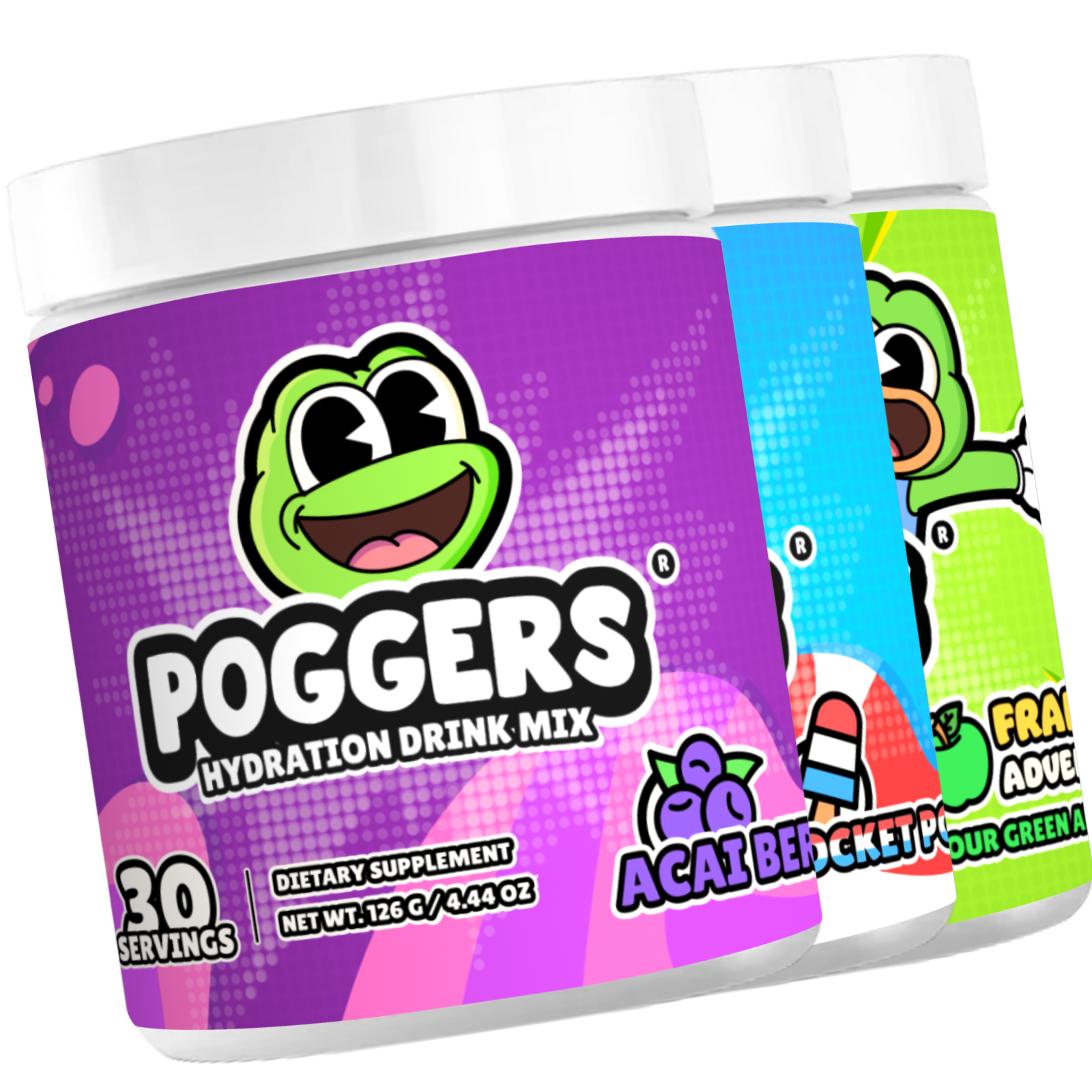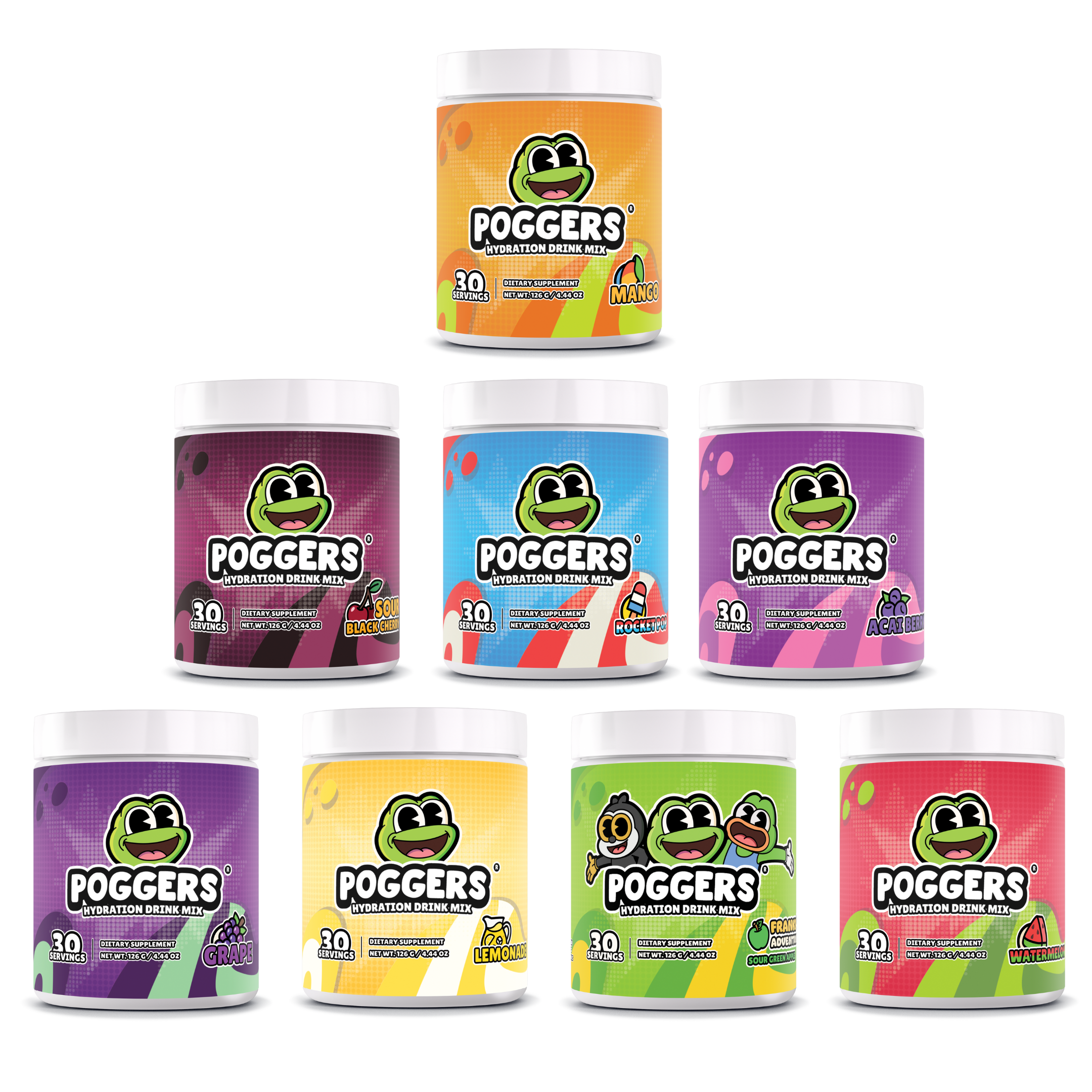 POGGERS® Hydration Drink Mix helps restore electrolytes and other essential vitamins with a simple blend of natural ingredients and no artificial colors. Each serving contains Vitamin A-E, Calcium, Magnesium, Potassium, Sodium, and Coconut Water Powder. POGGERS® Hydration Drink Mix does not contain Caffeine.